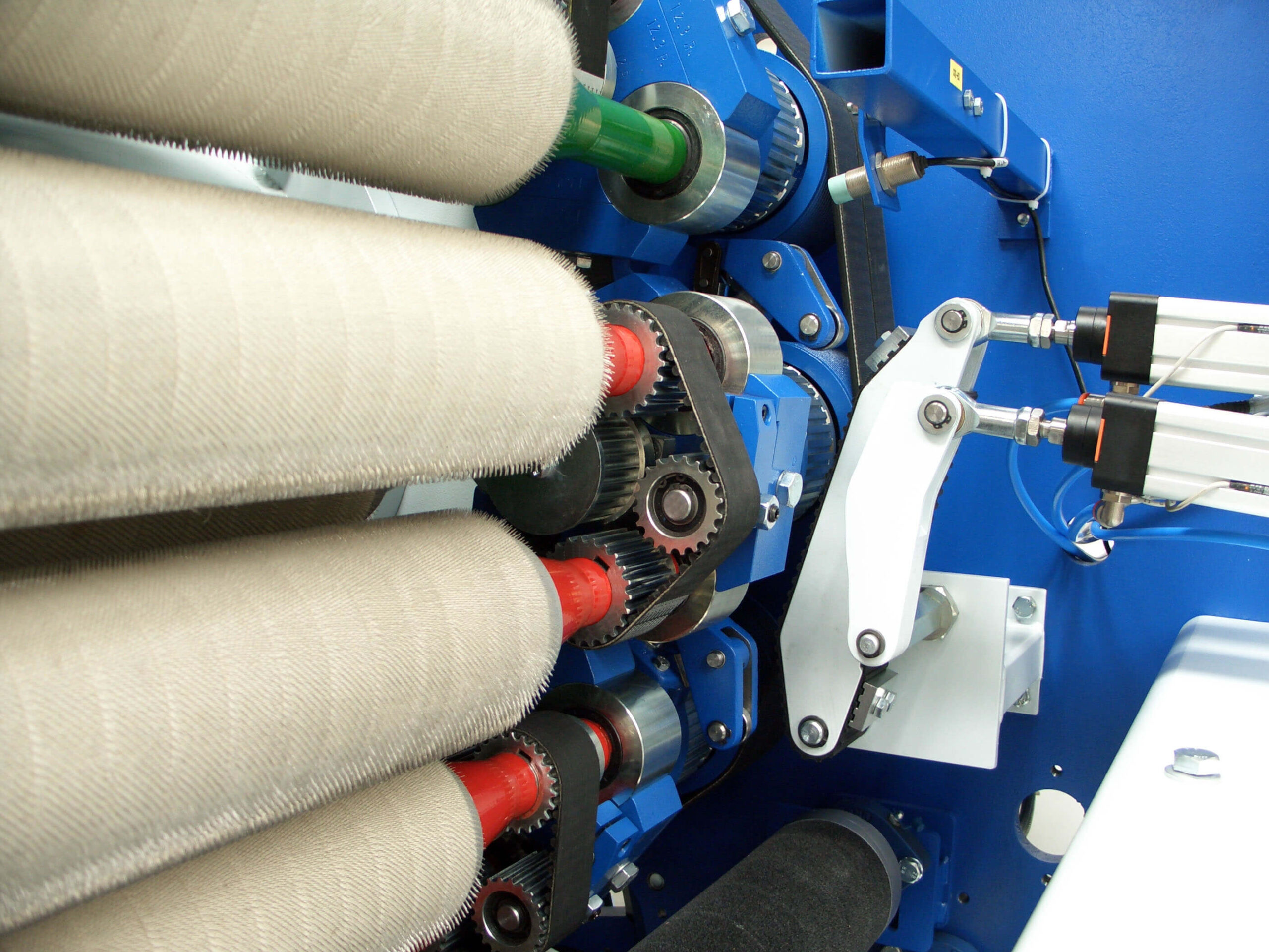 El esmerilado textil de Xetma Vollenweider emplea la tecnología Multiple Roller Action con hasta 24 rodillos, garantizando altos volúmenes de producción y acabados de primera clase en una sola pasada. Permite seleccionar libremente el sentido de trabajo (a favor, en contra o alternado), logrando efectos como Peach Skin o Rose Petal en distintos tejidos. Su diseño reduce la tensión del material, protege la solidez del color y asegura una larga vida útil de las guarniciones